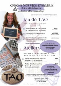 Au cours de cette journée, nous plongerons dans le jeu de TAO, un outil puissant pour explorer votre potentiel créatif et écrire votre vie. Nous découvrirons qui vous souhaitez être et devenir, et nous poserons les bases de sa concrétisation. Ce moment privilégié vous permettra de mettre en lumière vos intentions et de tracer votre chemin vers l’avenir, tout en respectant qui vous êtes, avec le soutien bienveillant du groupe.